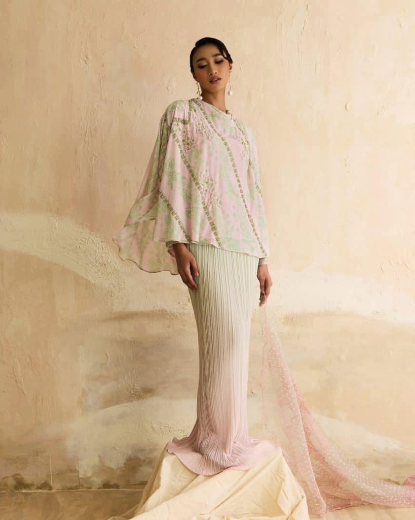 Syomirizwa Gupta shares a couture and dramatic Eid luxe collection, ‘Journey Through The Silk Road’ – deeply rooted in tradition, yet standing out with meticulous finishings. Look poised in bias-cut skirts and lightweight long blouses, including kebaya and kebarung, adorned with kerongsang-style details in fluid and soft fabrics like cotton linen blend, satin, and chiffon crepe. Prices start from RM2,300 per garment.