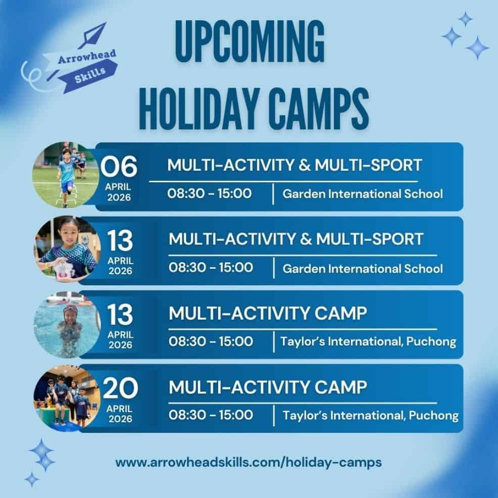 Age: Multi-Activity Camp (4 to 12 years old), Multi-Sports Camp (8 to 15 years old) at Garden International School; Multi-Activity Camp (4 to 12 years old) at Taylor’s International School