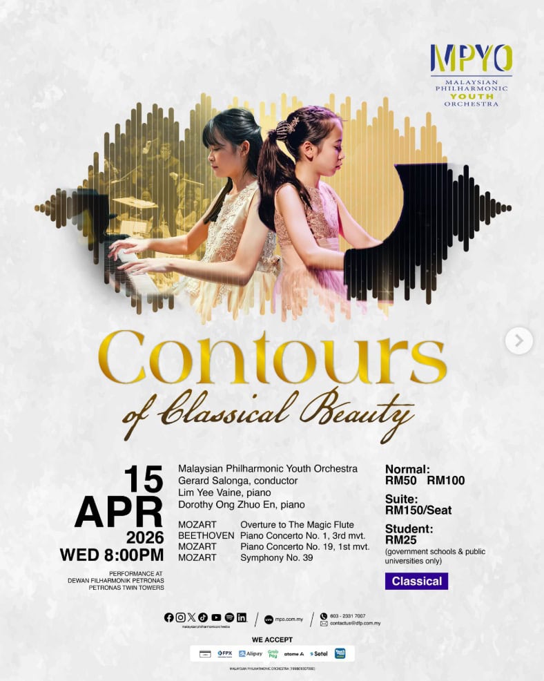 Talented Malaysian youths take centre stage with the MPYO, conducted by Gerard Salonga. Highlights include Beethoven’s playful Piano Concerto No. 1, 3rd Movement with soloist Lim Yee Vaine, and Mozart’s sparkling Piano Concerto No. 19, 1st Movement with pianist Dorothy Ong. The programme opens with the lively Overture to The Magic Flute and concludes with Mozart’s joyous Symphony No. 39.