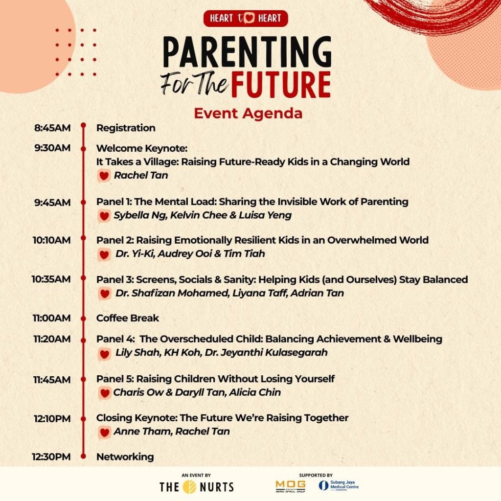 Organised by The Nurts, a Malaysian brand devoted to nurturing emotional intelligence, meaningful conversations, and lifelong learning through play, the event will feature speakers including Dr Yi-Ki (Paediatrician), Anne Tham (Founder and Group CEO of ACE EdVenture Group), Dr Jeyanthi Kulasegarah (Paediatric ENT Surgeon), Audrey Ooi and Tim Tiah (content creators and co-founders of Colony Co-Working Space and Events), Charis Ow and Daryll Tan (content creator and co-founder of OpenMinds Group, respectively), Alicia Chin (Chairman of IBU Family), Lily Shah (COO, Parenthood Media), and more.