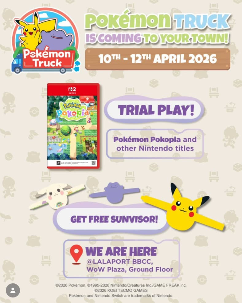 Calling all Pokémon fans! The Pokémon Truck rolls in with Pokémon Pokopia, other hit Nintendo titles, and plenty of adventures for fellow trainers. Catch the fun, challenge your friends, and dive into a world of Pokémon excitement at LaLaport.