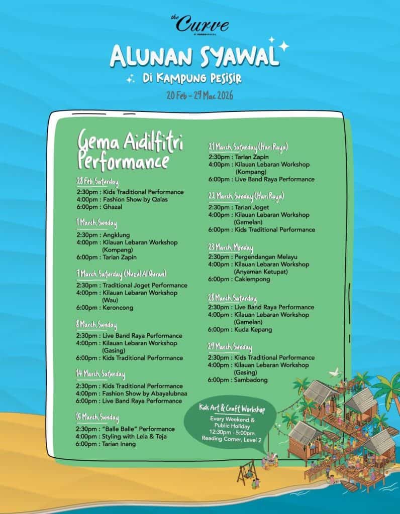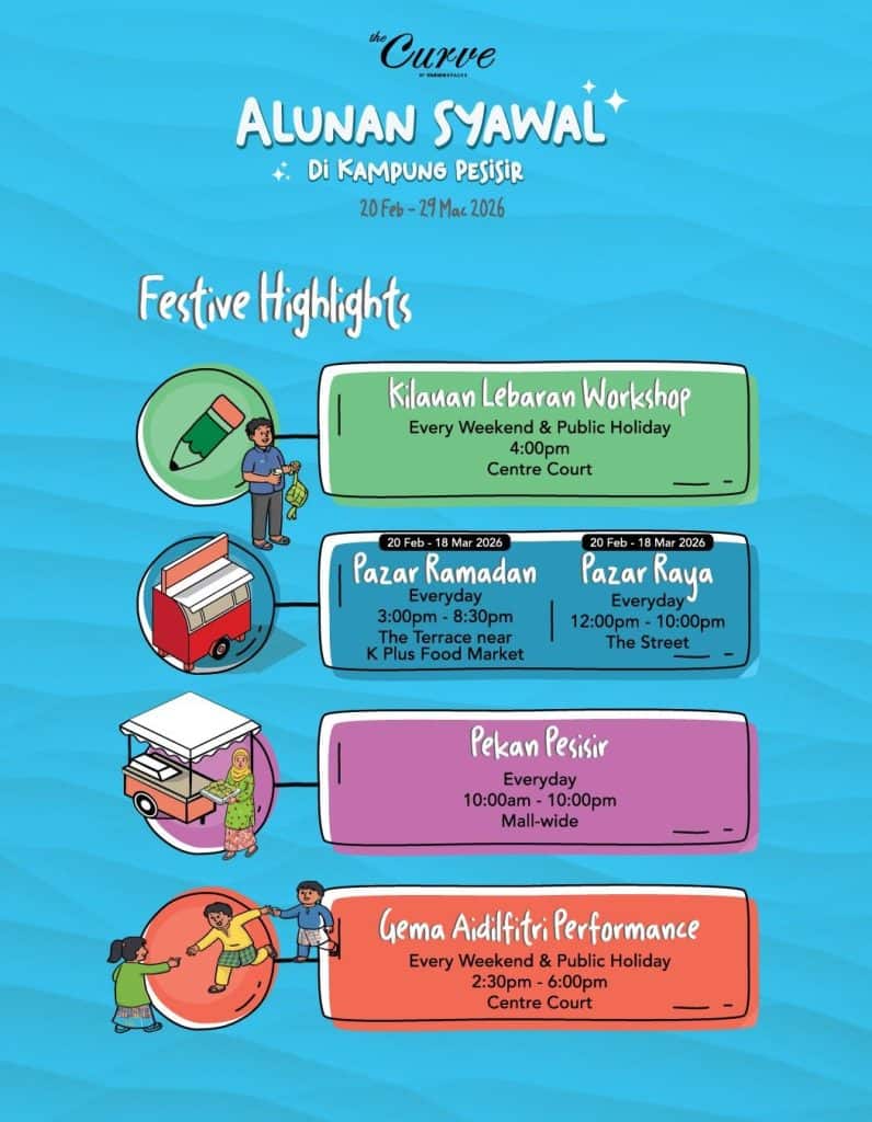Here’s what’s happening at the Curve: enjoy traditional Raya performances, hands-on Aidilfitri workshops, and bubur lambuk distribution that evoke the warmth of kampung memories. Browse Pazar Ramadan and Pazar Raya finds, and visit the Kongsi Rezeki booth in the true spirit of giving this festive season.